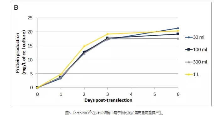 FectoPRO?介導的轉(zhuǎn)染無需改變流程便可將細胞培養(yǎng)基按比例從30ml擴展至數(shù)升。