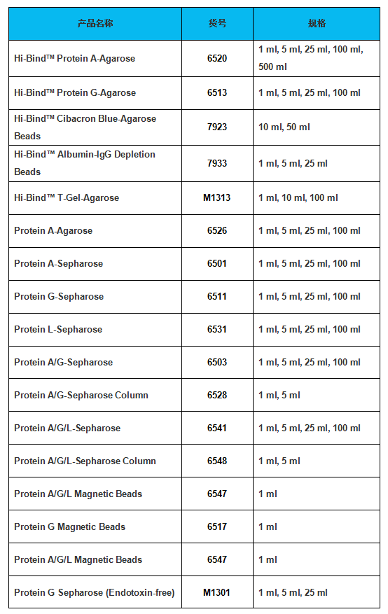 BioVision公司生產的 Hi-BindTM T-Gel Agarose beads 是T-gel 瓊脂糖凝膠法,具有很高的蛋白結合能力,可達30mg蛋白/ml beads。同時,可兼容多種樣本,任何類型的免疫球蛋白都可純化,如來自血清、腹水、組織或細胞培養液等樣本中的IgG, IgE, IgM, IgA, IgY 和Fab 片段等。
