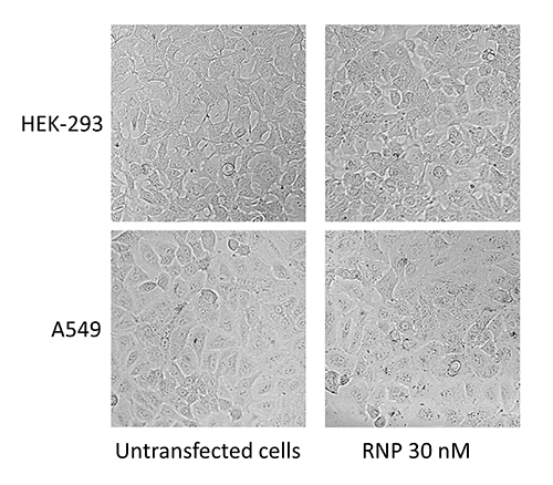 在96孔板中用30nm RNP(Cas9蛋白和HPRT1 sgRNA)和0.3 μl的jetCRISPR?轉(zhuǎn)染HEK-293和A549細(xì)胞,轉(zhuǎn)染48h后,使用phase contrast ZOE Fluorescent Cell Imager (BIORAD?)觀察細(xì)胞狀態(tài)。