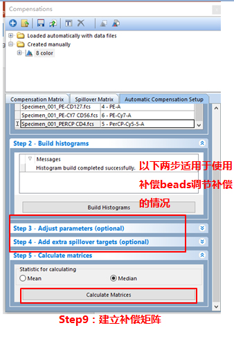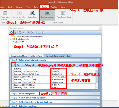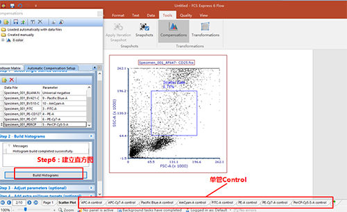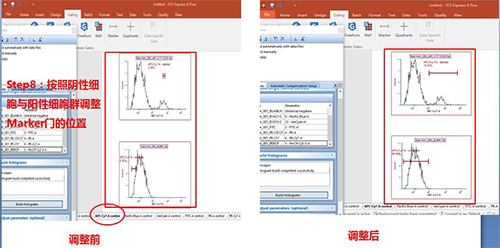 依次調(diào)整好各單管Control的Marker門(mén)的位置。此處不一一列舉。回到補(bǔ)償界面。此處的3、4適用于使用補(bǔ)償beads調(diào)節(jié)補(bǔ)償?shù)那闆r(由于本次數(shù)據(jù)為細(xì)胞,此處不詳細(xì)列出,如對(duì)此步驟感興趣,可咨詢小達(dá)君)