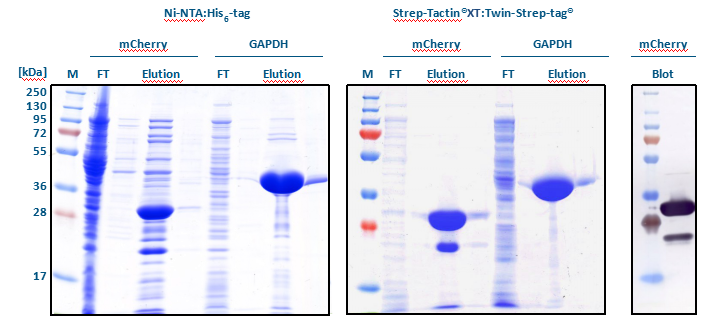 以SDS-PAGE分析發現,不管是mCherry或是GAPDH,使用Strep-tactin? XT: Twin-Strep-tag?都能得到純度較高的目標蛋白(見Elution)。Western Blot分析結果顯示,提取mCherry所出現的雜質為其降解產物。