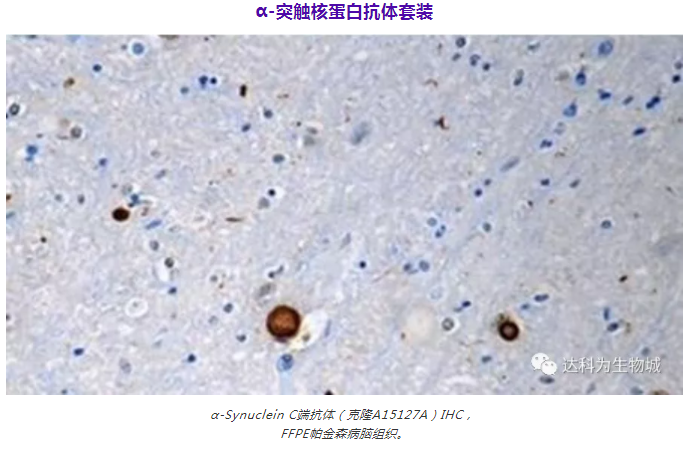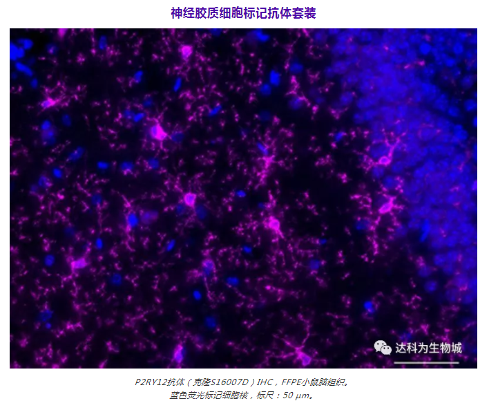 神經膠質細胞抗體套裝中包含檢測常見神經膠質細胞的標記物,如趨化因子受體1抗體(CX3CR1)、膠質纖維酸性蛋白(GFAP)、髓磷脂(Myelin)和嘌呤能受體(P2RY12)。其中的輔助試劑可以檢測各種屬磷酸化或總α-突觸核蛋白/Tau,這些聚集物與阿爾茨海默癥和帕金森皆有重大關聯。