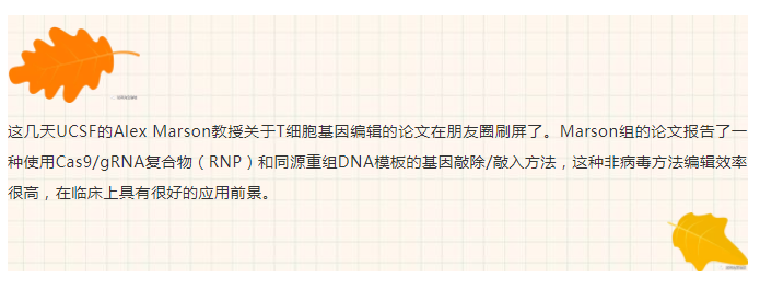 文章的共同通訊作者為密西根大學的徐捷教授和康奈爾大學的夏曉峰教授。這篇文章和Marson組文章的共同點是都使用電轉Cas9RNP的方法在一些之前認為很難編輯的細胞上取得了很高的同源重組效率。Marson實驗室的研究更加深入,在免疫治療上幾個重要的基因位點做了基因編輯的研究,不僅對于CAR-T可能有很大幫助,對于TCR-T的制備可能也有重要意義。