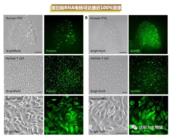 徐、夏兩個實驗室主要從事干細胞和轉基因動物模型研究,因此對于基因編輯主要著眼在方法學上,力爭使基因編輯高效并且簡單,可以普遍性地應用于各種細胞上。相比于Marson組的文章,徐、夏這篇文章還報道了在除了T細胞之外的多種細胞包括iPSC干細胞,MSC間充質干細胞,以及一些細胞系上取得的良好效果。