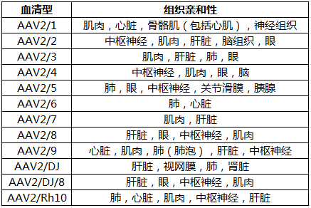 目前發現的AAVAAV1~AAV11DJ12種不同的血清型,主要區別在于衣殼蛋白Cap的不同,并決定不同血清型AAV對不同的組織和細胞有不同的感染效率。