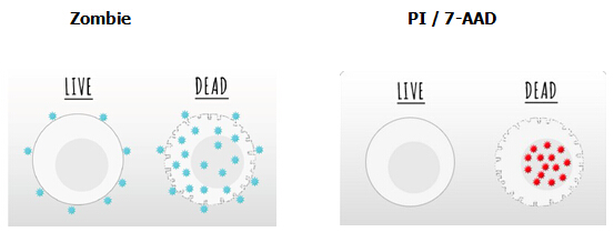 Zombie Dyes有別于PI和7-AAD等DNA染料,它是一種可用于需固定細(xì)胞實驗的染料,通過與細(xì)胞上蛋白質(zhì)的氨基結(jié)合來實現(xiàn)。因活細(xì)胞可排除染料,所以僅細(xì)胞膜被著色;而死細(xì)胞的細(xì)胞膜及細(xì)胞質(zhì)均被著色,繼而根據(jù)熒光信號的強(qiáng)弱來區(qū)分死/活細(xì)胞。而且Zombie Dyes可選擇性多,可以由不同的激發(fā)光激發(fā),便于靈活選擇。