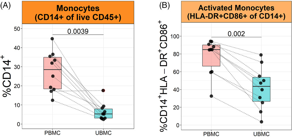 外周血單核細胞CD45+CD14+)占比12.47% ~ 44.69% N=10,平均百分比為27.42 ± 3.31%。胎盤床樣本中CD45+CD14+單核細胞的平均百分比占活CD45+細胞6.38 ± 1.45%低于PBMC27.42 ± 3.31,5A。此外,與外周血單核細胞相比,胎盤床單核細胞活化標志物CD86HLA-DR的表達比例較低(在CD14+細胞占比分別為50.24 ± 7.53%90.63 ± 2.60%)(5B。