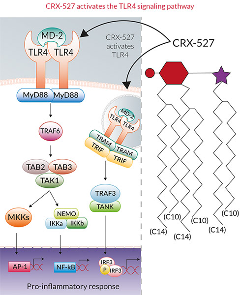 CRX-527屬于AGP(aminoakylglucoaminide 4-phosphate)家族,是一種合成的脂質(zhì)A類似物,可以激活Toll樣受體4(TLR4),進而啟動MyD88和TRIF依賴的促炎信號級聯(lián)反應(yīng)。重要的是,CRX-527無需TLR4輔助受體CD14即可激活TRIF介導(dǎo)的Ⅰ型干擾素信號通路。 CRX-527與其他AGPs一樣,毒性低于LPS,并且重要的是保留了它的免疫刺激特性。作為未來的疫苗佐劑和單獨的免疫刺激劑,AGPs具有巨大潛力。