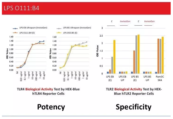 比較InvivoGen和E品牌TLR4特異性LPS(Utrapure)發(fā)現(xiàn),E品牌雖然號稱TLR4 specific agonist,但是可同時激活TLR2和TLR4,而InvivoGen的Ultrapure LPS只能特異性激活TLR4。